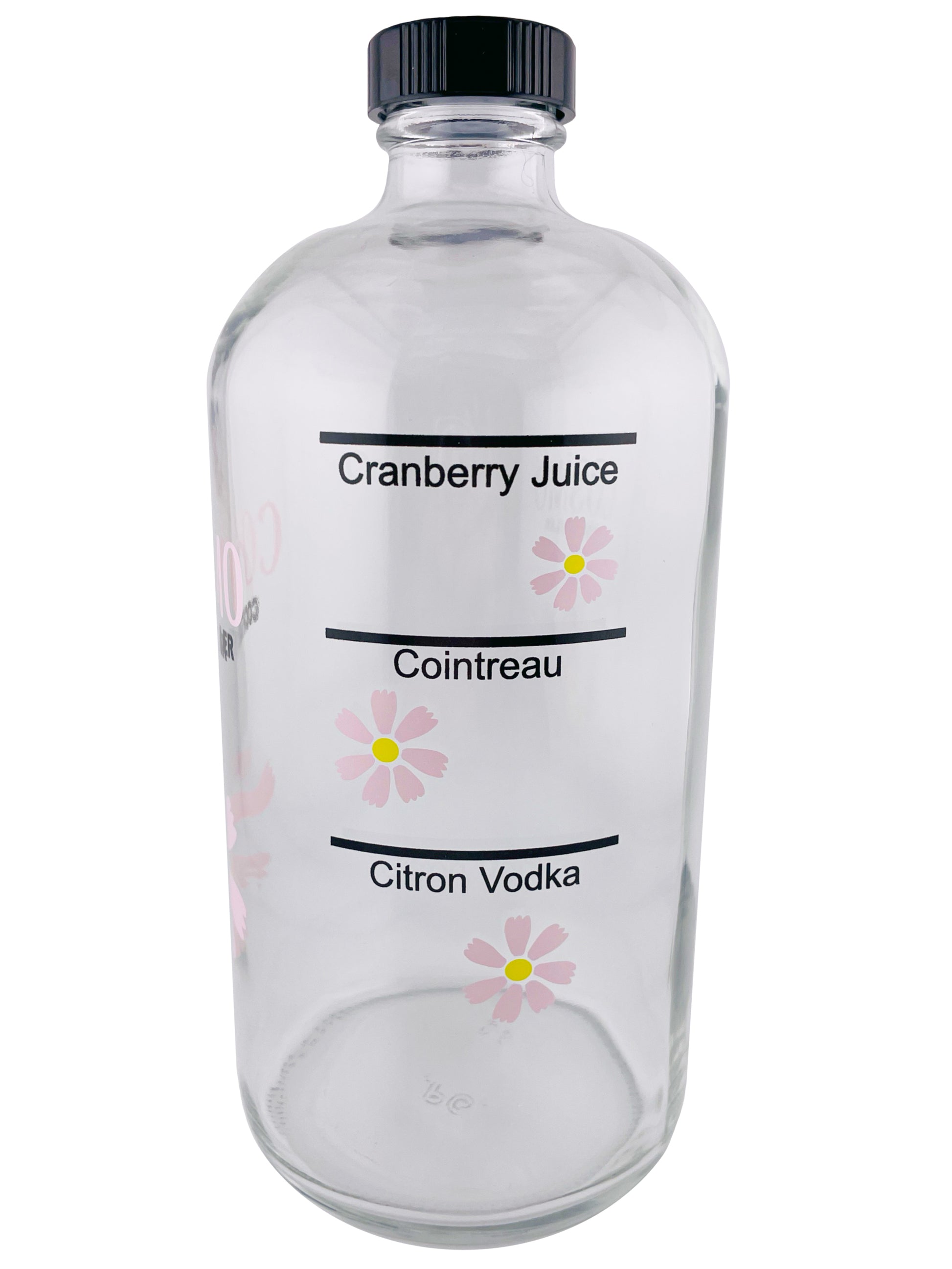 A Cocktailer is a 32 oz clear glass bottle with pour-to lines for your ingredients.