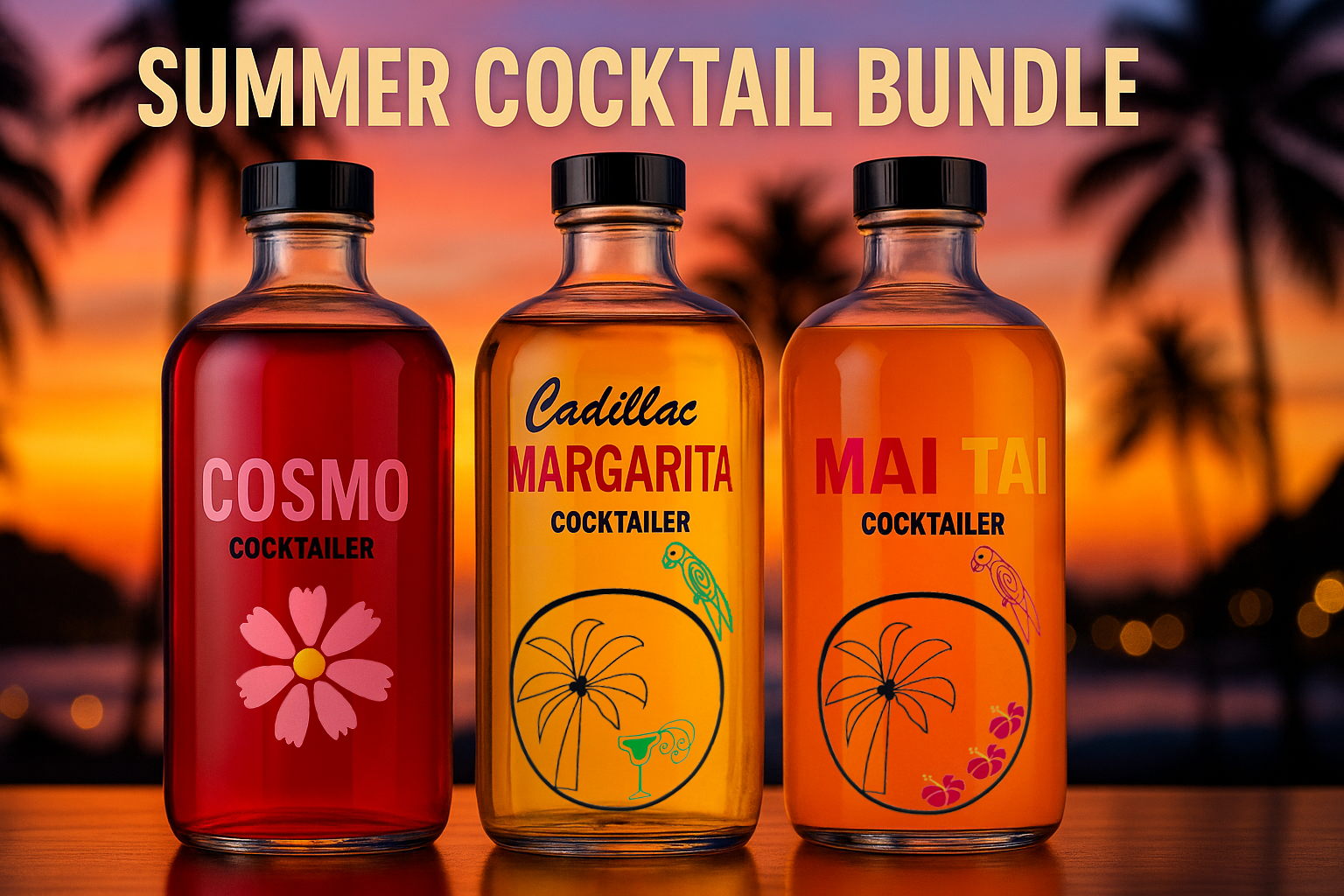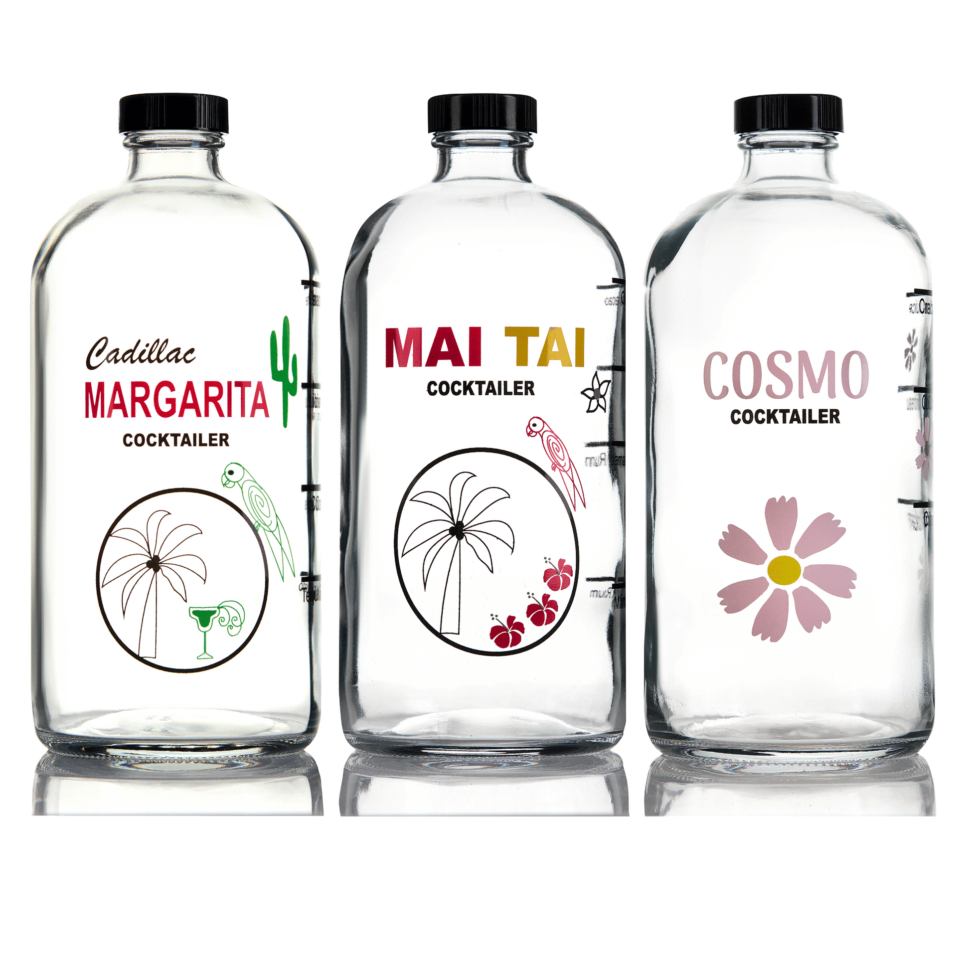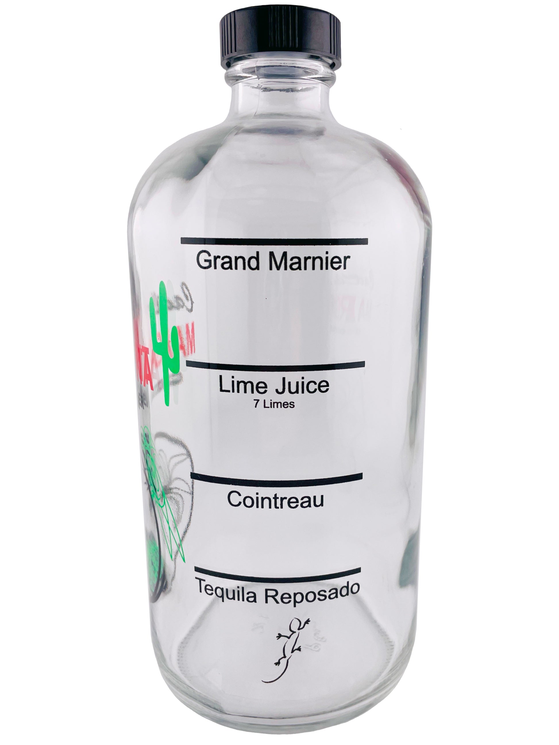 A Cocktailer is a 32 oz clear glass bottle with pour-to lines for your ingredients.